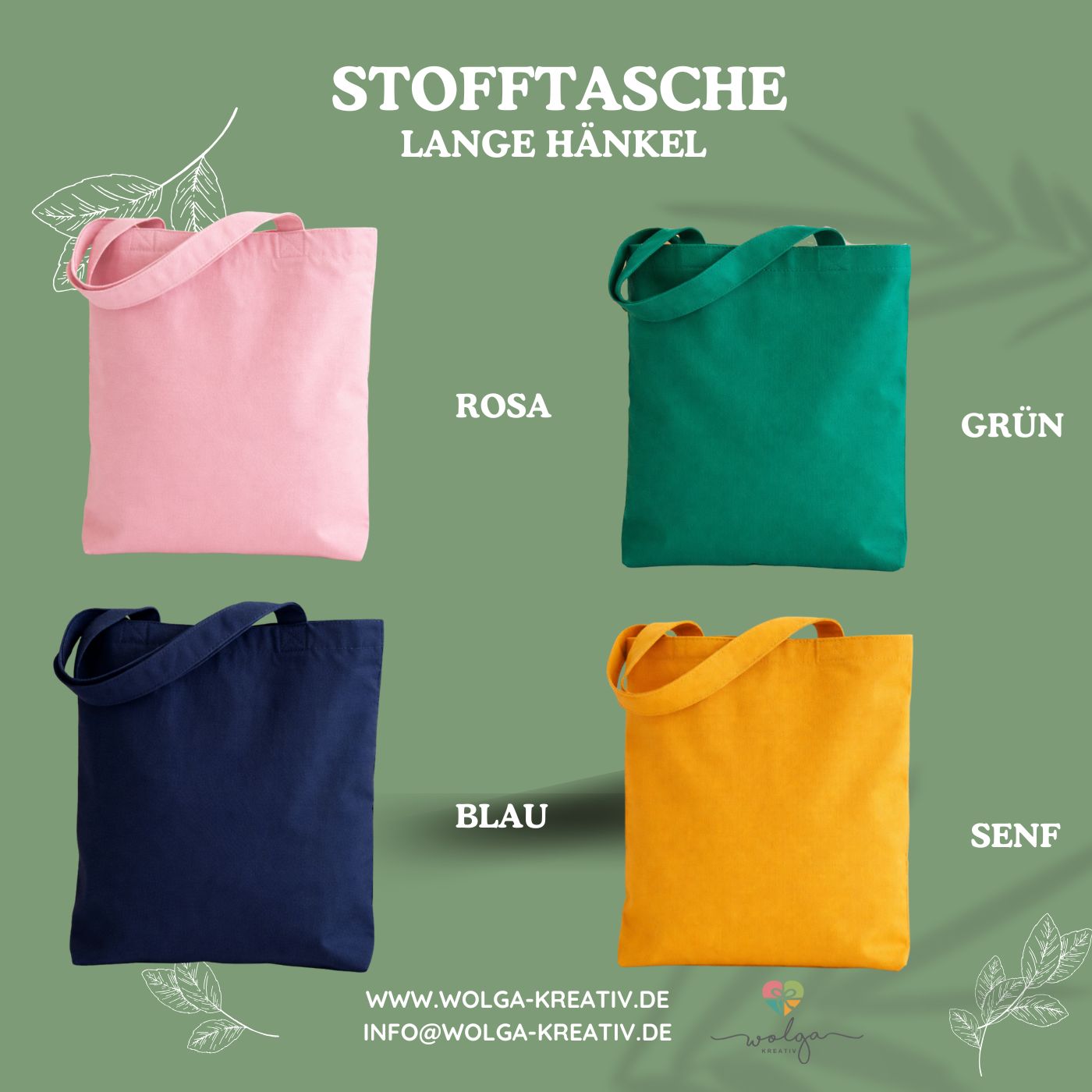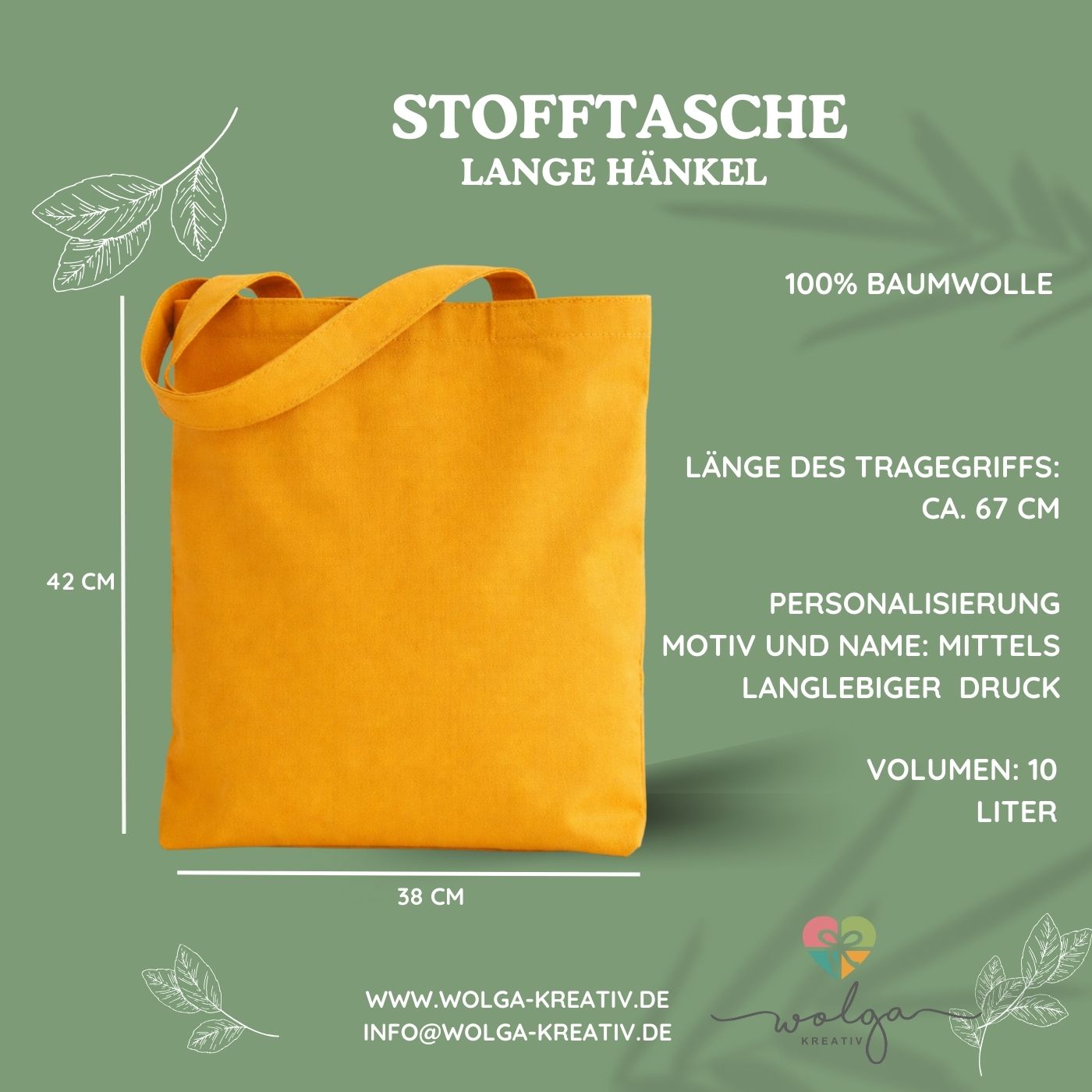 Die Stofftasche hat eine Größe von ca. 42 x 38 cm und lange Tragegriffe von ca. 67 cm.