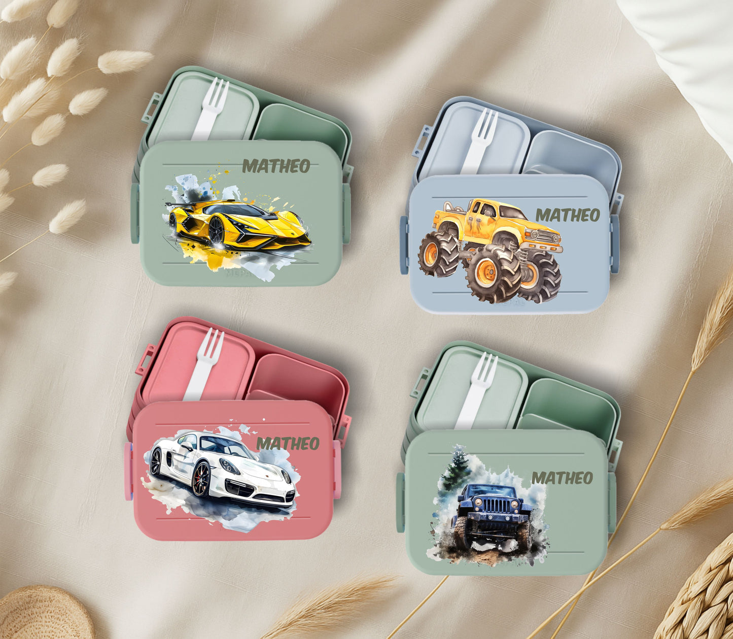 Diese personalisierte Brotdose für Jungs mit coolen Auto-Motiven ist der perfekte Begleiter für Kindergarten, Schule oder Ausflüge. Ob Rennwagen, Monstertruck oder Geländewagen – jedes Motiv wird hochwertig auf die Mepal Brotdose gedruckt, zusammen mit dem Wunschnamen deines Kindes. Ideal für kleine Autofans, die ihre Snacks stilvoll und praktisch transportieren möchten.